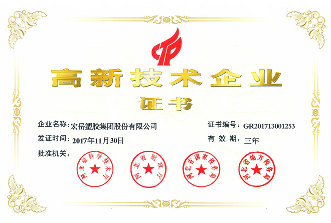 Hongyue was regarded as a high-tech enterprise in Hebei Province, and Hongyue brand plastic pipes and fittings were recognized as national inspection-free products.