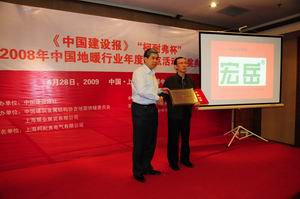 4月28日下午,《中国建设报》主办的2008年中国地暖行业年度盘点活动颁奖典礼在上海光大中心酒店隆重举行,秦皇岛九游管业当选“2008年中国地暖行业PE-Xa管材领军品牌”,沉甸甸的牌匾由中国建筑金属结构协会地面供暖委员会华明九主任亲手授予九游公司总经理助理王明科。本次盘点活动中张思良副总经理获得2008年度地暖行业十大风云人物提名。