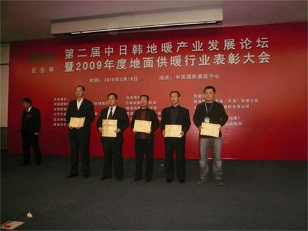 最后,会议进入地面供暖行业年度表彰颁奖仪式环节,秦皇岛九游塑胶有限公司凭借近年来的稳固发展以及在地暖行业的突出贡献被评选为“2009年度地暖行业先进集体”,张思良和王明科当选为“2009年度地暖行业先进个人”。本次会议的胜利召开及以上荣誉的获得,充分证明了九游公司在全国地暖行业的优势地位,同时也为公司的进一步发展打下了坚实的基础。