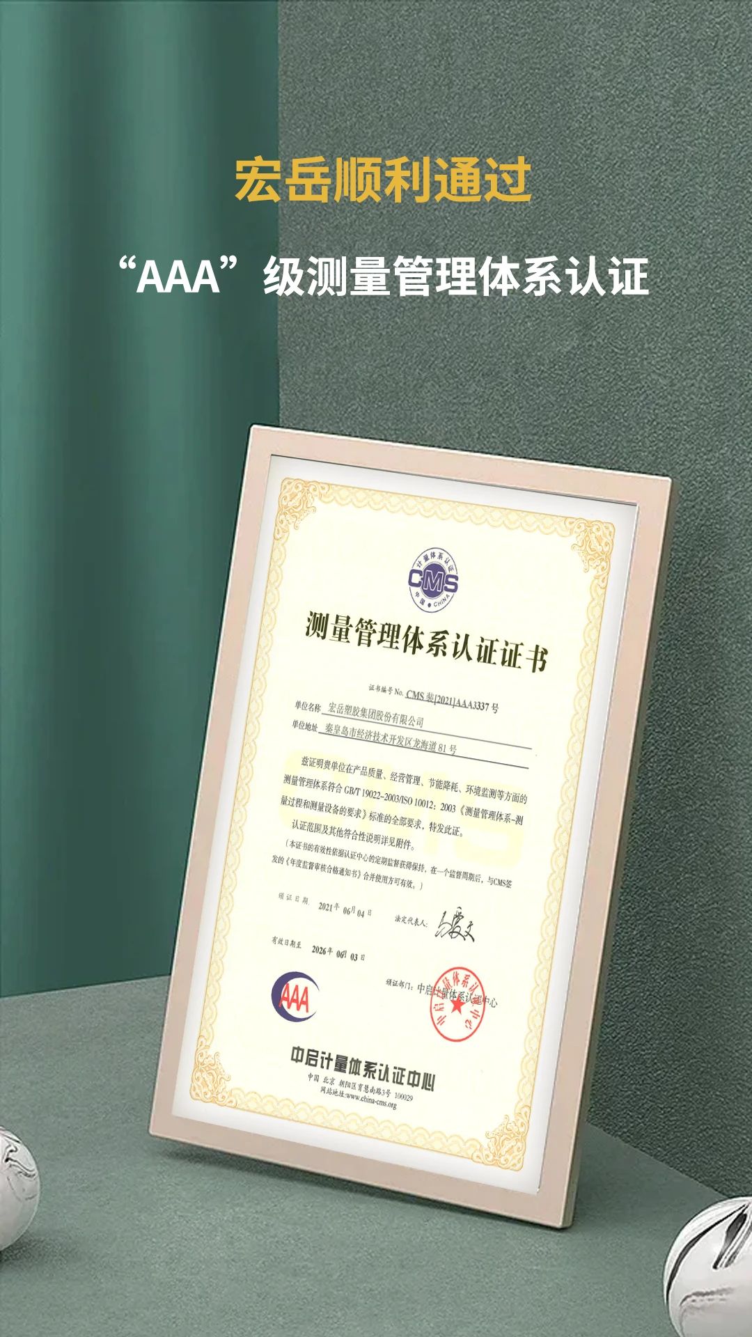 九游顺利通过ISO10012:2003“AAA”级测量管理体系认证,并获得证书。