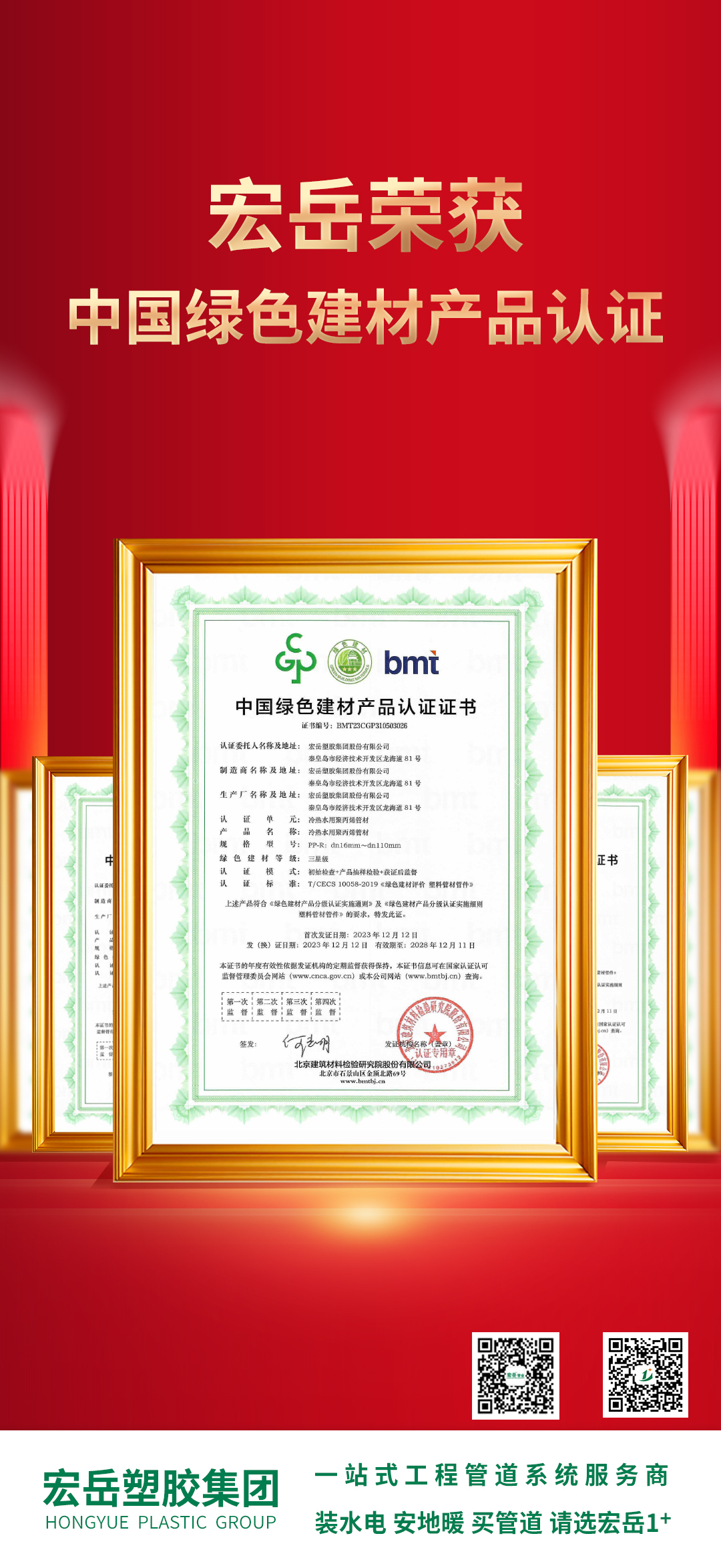 九游获得中国绿色建材产品认证,本次认证对PPR、PVC、PE、PE-Xa、PE-RT管材管件等11个单元的系列产品,以环保、节能、节水、循环、低碳等评价维度进行了相关审核,九游集团顺利通过。